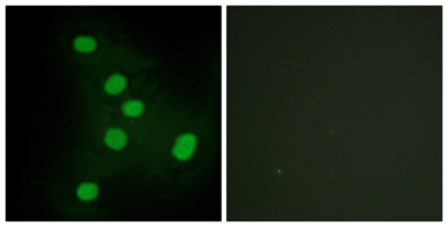 Immunofluorescence analysis of HepG2 cells, using NR2F6 Antibody. The picture on the right is blocked with the synthesized peptide.