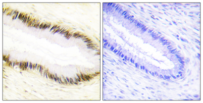 Immunohistochemistry analysis of paraffin-embedded human cervix carcinoma tissue, using NR2F6 Antibody. The picture on the right is blocked with the synthesized peptide.