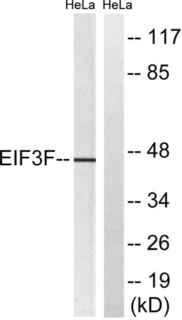 function:Component of the eukaryotic translation initiation factor 3 (eIF-3) complex, which is required for several steps in the initiation of protein synthesis. The eIF-3 complex associates with the 40S ribosome and facilitates the recruitment of eIF-1, eIF-1A, eIF-2:GTP:methionyl-tRNAi and eIF-5 to form the 43S preinitiation complex (43S PIC). The eIF-3 complex stimulates mRNA recruitment to the 43S PIC and scanning of the mRNA for AUG recognition. The eIF-3 complex is also required for disassembly and recycling of posttermination ribosomal complexes and subsequently prevents premature joining of the 40S and 60S ribosomal subunits prior to initiation.,mass spectrometry: PubMed:17322308,mass spectrometry: PubMed:18599441,PTM:Phosphorylated. Phosphorylation is enhanced upon serum stimulation.,similarity:Belongs to the eIF-3 subunit F family.,similarity:Contains 1 MPN (JAB/Mov34) domain.,subunit:Component of the eukaryotic translation initiation factor 3 (eIF-3) complex, which is composed of 13 subunits: EIF3A, EIF3B, EIF3C, EIF3D, EIF3E, EIF3F, EIF3G, EIF3H, EIF3I, EIF3J, EIF3K, EIF3L and EIF3M. The eIF-3 complex appears to include 3 stable modules: module A is composed of EIF3A, EIF3B, EIF3G and EIF3I; module B is composed of EIF3F, EIF3H, and EIF3M; and module C is composed of EIF3C, EIF3D, EIF3E, EIF3K and EIF3L. EIF3C of module C binds EIF3B of module A and EIF3H of module B, thereby linking the three modules. EIF3J is a labile subunit that binds to the eIF-3 complex via EIF3B. The eIF-3 complex interacts with RPS6KB1 under conditions of nutrient depletion. Mitogenic stimulation leads to binding and activation of a complex composed of FRAP1 and RAPTOR, leading to phosphorylation and release of RPS6KB1 and binding of EIF4B to eIF-3., |