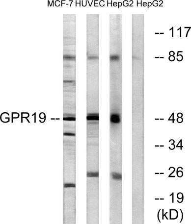 Western blot analysis of lysates from MCF-7, HUVEC, and HepG2 cells, using GPR19 Antibody. The lane on the right is blocked with the synthesized peptide.