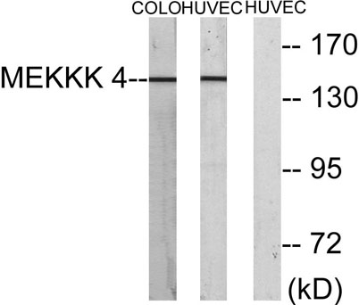 The antiserum was produced against synthesized peptide derived from human MEKKK 4. AA range:406-455