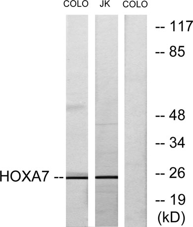 The antiserum was produced against synthesized peptide derived from human HOXA7. AA range:91-140