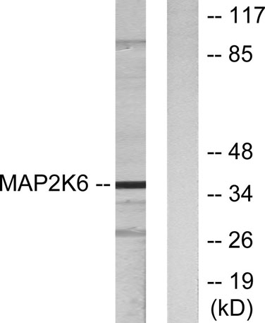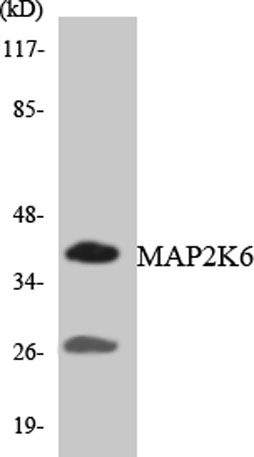The antiserum was produced against synthesized peptide derived from human MAP2K6. AA range:1-50