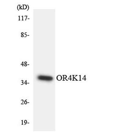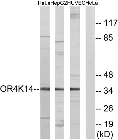 The antiserum was produced against synthesized peptide derived from human OR4K14. AA range:261-310