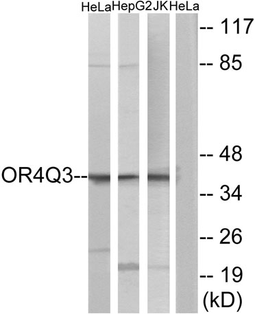 Immunogen: The antiserum was produced against synthesized peptide derived from human OR4Q3. AA range:264-313