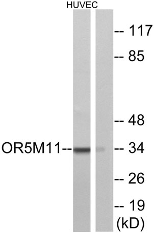 The antiserum was produced against synthesized peptide derived from human OR5M11. AA range:233-282