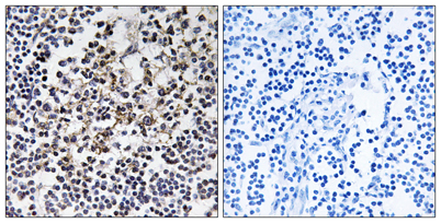Immunohistochemistry analysis of paraffin-embedded human lymph node tissue, using PGLS Antibody. The picture on the right is blocked with the synthesized peptide.