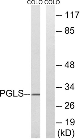 Western blot analysis of lysates from COLO cells, using PGLS Antibody. The lane on the right is blocked with the synthesized peptide.